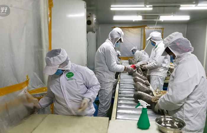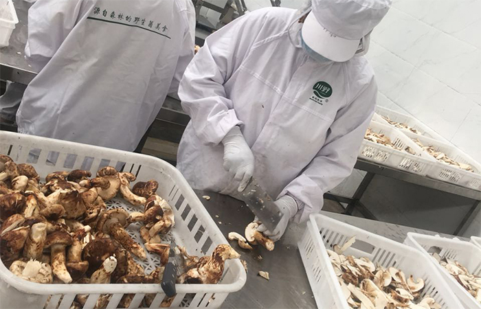 园区工人将新鲜松茸切片保存