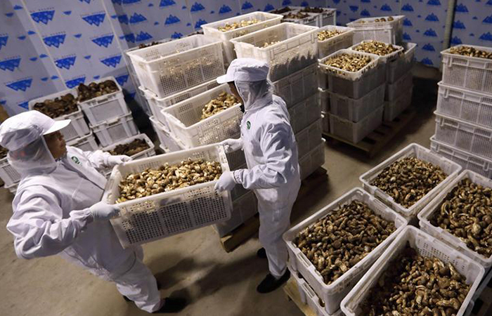 园区工人将新鲜松茸放入冻库保