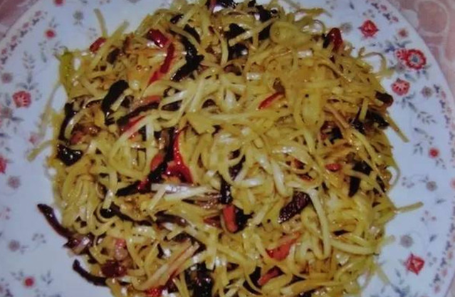 4.锅内注入油,火腿丝炒香屑下虎掌菌丝煸炒,把韭菜苔、面条翻炒。清汤、盐、胡椒面入碗调匀,烹入锅内翻炒均匀,装盘即成。