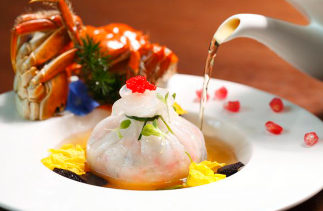 5.边上放进菊花瓣,面上放蟹籽、兰豆苗点缀,刨入两片黑松露,番石榴籽摆碟边,与热的炖鸡汤一起上桌,于客人面前淋入即可享用。