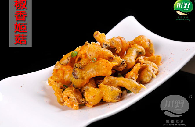 4.再将捞出的姬菇放入油锅中复炸30秒(时间自己控制,根据炸出的颜色调整时间),起锅关火,撒上椒盐,美味即成。