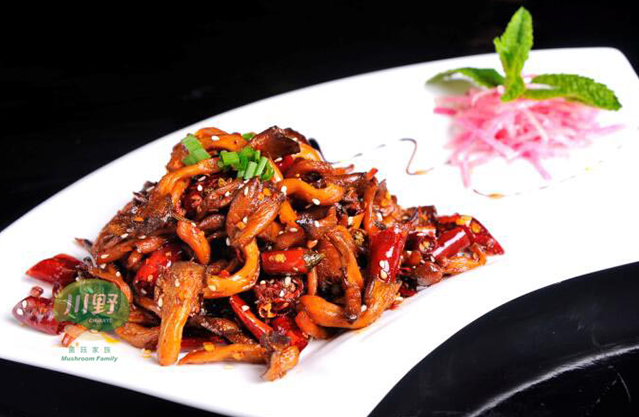 4.起锅放油,加花椒,出香味后加入切好的红椒,翻炒1分钟,倒入炸好的姬菇;