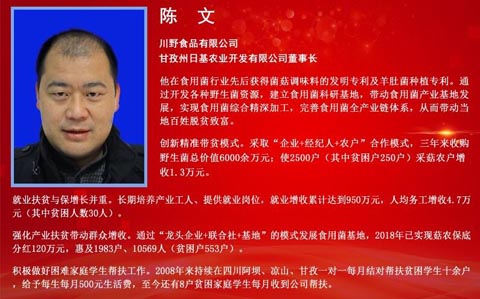 作为四川川野食品有限公司和甘孜州日基农业开发有限公司两家四川省省级农业产业化龙头企业的董事长,陈文先生在企业稳健发展的同时,积极投身精准扶贫的事业中,通过一系列举措为精准扶贫贡献自己的一份力量。