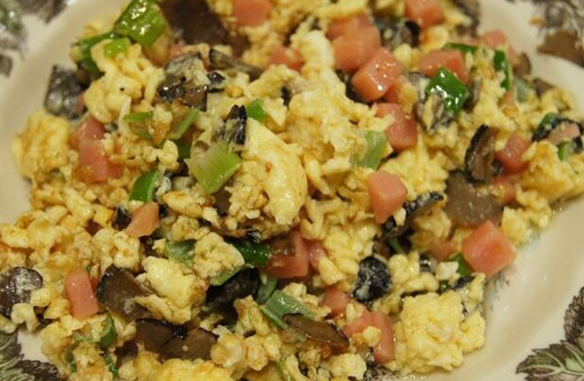 主料:鸡蛋2-3枚、黑松露2-3个 辅料:香肠1只,葱绿适量 调料:盐少许、川野山珍精少许、