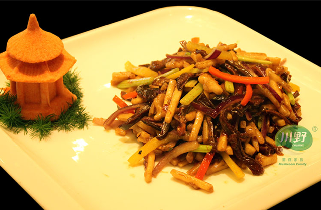 菌香五丝主料铜色牛肝菌150g,年糕150g辅料芹菜15g,红椒15g,青椒15g调料XO酱5g,盐3g,川野山珍精(增味型)5g烹制1.铜色牛肝菌洗净,年糕、芹菜、红椒、青椒切丝,铜牛菌汆水2.炒锅置火上,